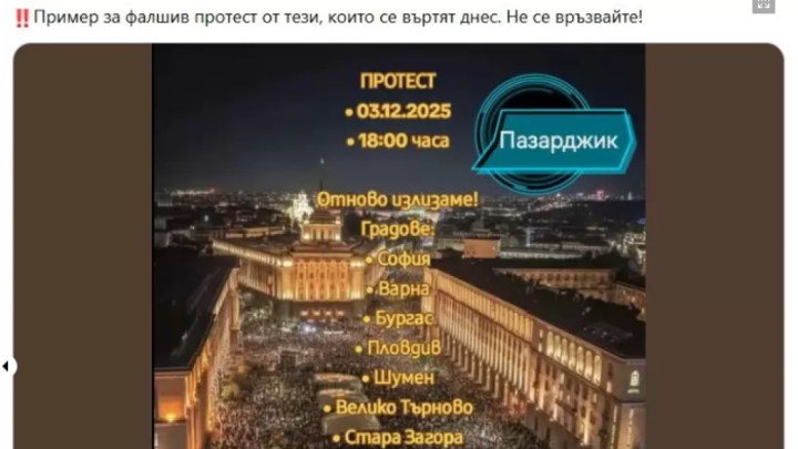 "Здравейте приятели от Бургас! Понеже има доста хора, объркани, от вчера има тролски профили, които са се навъдили в Тикток, Тредс и др. социалки, предупреждавам - Споделят фейк новини за протести на 03.12. !!! Такава организация НЯМА. Иска се разрешение и 48-часово уведомление в общината преди протест!, предупреждава друг, цитиран от "24 часа".
