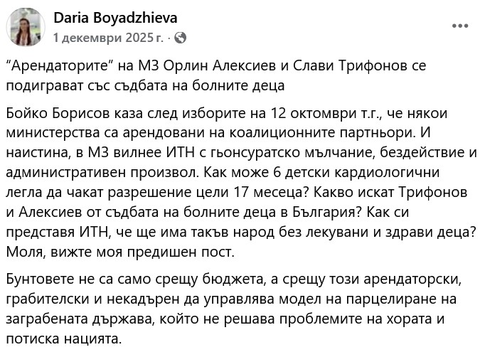 Партията на чалгарите и ренегатите във всички коалиции, в които са участвали, преди 12 месеца получи във феодално владение Министерството на здравеопазването и други ведомства и регулатори. Огромна част от възмущението на протестиращите, които свалиха правителството през декември, произтича от тази феодализация и модел на корупционно арендуване на държавни административни функции в лична полза на всеки от коалиционните партньори.