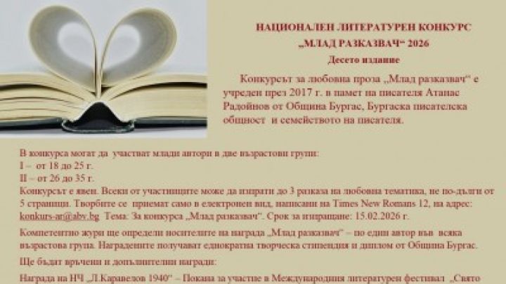 Община Бургас обявява десетото издание на Националния литературен конкурс за любовна проза „Млад разказвач“, учреден през 2017 г. в памет на писателя Атанас Радойнов. Конкурсът се организира съвместно с Бургаската писателска общност и семейството на писателя.
