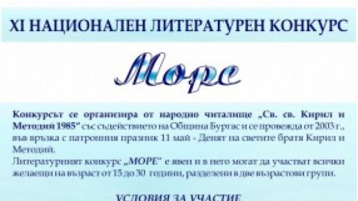 XI Национален литературен конкурс МОРЕ очаква вашите стихотворения. Конкурсът се организира от читалище „Св. св. Кирил и Методий 1985” със съдействието на Община Бургас и се провежда от 2003 г., във връзка с патронния празник 11 май - Денят на светите братя Кирил и Методий.