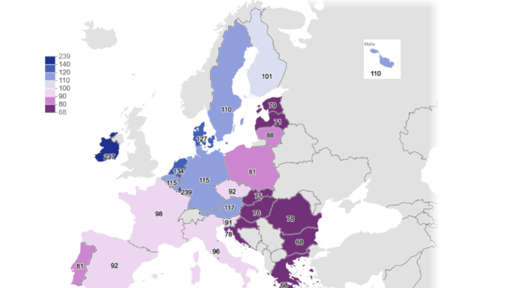 Франция, Кипър, Италия, Чехия, Испания и Словения са с по-малко от 10% под този среден показател, следвани от Литва, Португалия и Полша с между 10% и 20% под него.