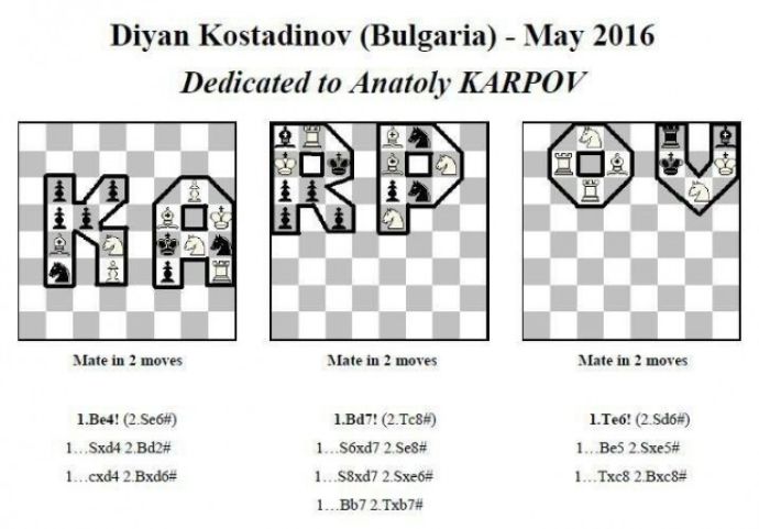 Специален подарък – три задачи с мат в два хода, фигурите, на които са подредени така че изписват на диаграмата името на Анатолий Карпов, поднесе олимпийският шампион по съставяне на шахматни задачи Диян Костадинов на великия гросмайстор. Карпов е в Поморие по покана на кмета на града Иван Алексиев, а бургаският шампион дойде за лична среща с госта.
