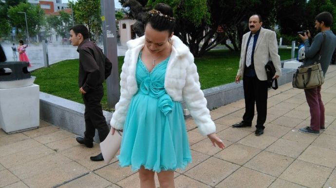 Прелестната абитуриентка Катерина от СОУ „Добри Чинтулов” сияе в синьо, бременна в седмия месец. Катерина, чието изпращане е на площад „Тройката”, е едно от най-усмихнатите лица на випуска. А неин кавалер е не кой да е, а бъдещият й син. Нежната дама скоро ще е горда майка на момче. За празничната нощ, Катерина е заложила на къса синя рокла, бяла кожена наметка и нежни бижута, час от които са вплетени във вдигната й на кок коса.