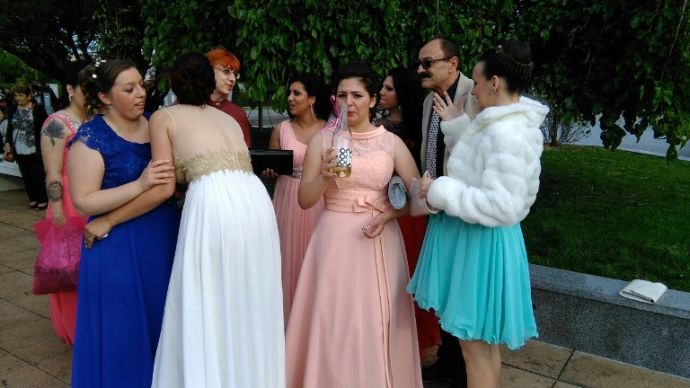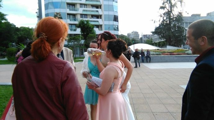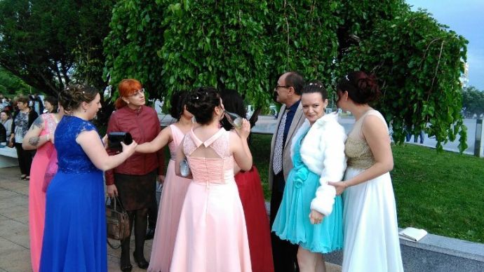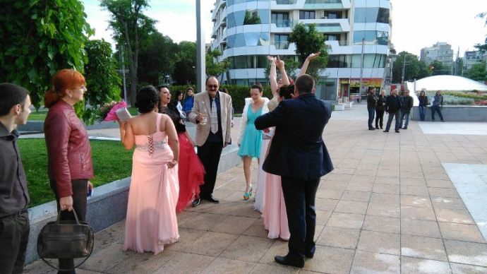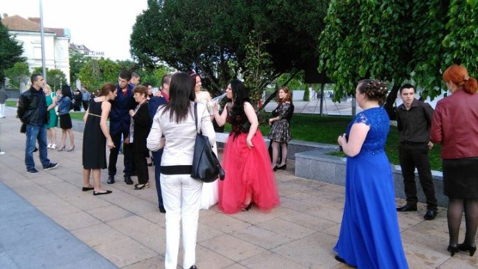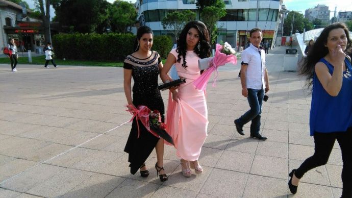 Втората вечер на Балове 2016 със сигурност може да се нарече вечерта на ексцентричните Пепеляшки. На площад „Тройката”, където в момента се събират възпитаниците на СОУ „Добри Чинтулов” и СОУ „Константин Петканов“, модното дефиле изглежда по необикновен начин. Най-много погледи привлича абитуриентка, която смело е комбинирала дълъг бял шлейф, под който има шортички от сатен. Корсетът на роклята й е украсен с черна бродерия, а вместо със задължителния ефирен шал, е наметната със сако, подходящо за бизнес среща. Всичко това в комбинация с безкрайни токчета и огнено червена грива.