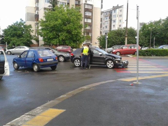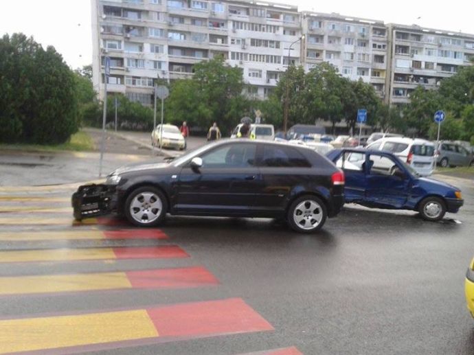 Двете коли са смазани – бронята на „Ауди”-то е откачена, след страничния удар в другия автомобил. Минути след инцидента, шофьорът на „Ауди”-то даваше показания пред полицията. В момента движението в района се контролира от служители на реда.![]()