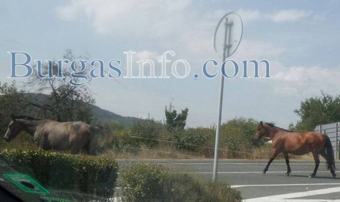 Коне изправиха на нокти шофьори на входа на Царево днес, като се разхождаха спокойно, лавирайки между колите на главния път от Бургас за Ахтопол. „Излизах от Царево и веднага след завоя, точно в средата на платното беше застанал един от конете. Щяхме да се блъснем директно в него. Друг пък беше блокирал отбивката на влизане в града, а трети се разхождаше на главния път за ужас на пътуващите в посока от Приморско към Ахтопол“, каза потървепвш водач пред БургасИНФО.