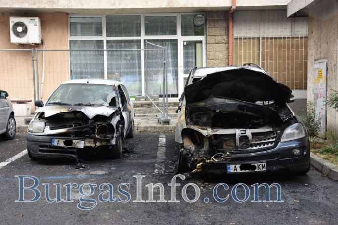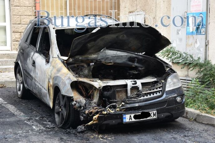 Черният джип „Мерцедес“ на бургаски бизнесмен изгоря на ул. „Константин Величков“ в центъра на Бургас, научи БургасИНФО. Колата палмнала пред дома на предприемача тази сутрин в 3,30 часа. Гърмежът на гумите вдигна на крак местните жители. Изхвърчалите пламтящи части запалили и съседния автомобил, паркиран по случайност в обсега на пожара. Той собственост на граничен полицай, който живее в същата сграда.