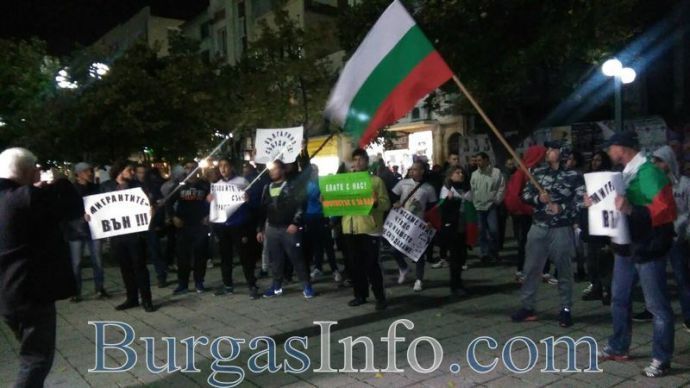 Поддръжниците на Петър Низамов – Перата, които тази вечер протестират срещу мигрантите, запяха химна пред сградата на Общината все едно са на футболна среща. Рехавото множество, съставено от яки момчета, криещи лицата си с качулки, бързо премина към скандирания: „Българи, юнаци” и „Всеки ден ще е така до победата”. В протеста участват не повече от 30 души, предава репортер на BurgasINFO. Протестът се охранява от полиция, а участниците развяват националния флаг.