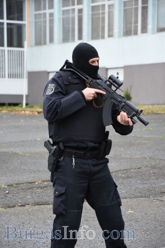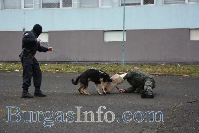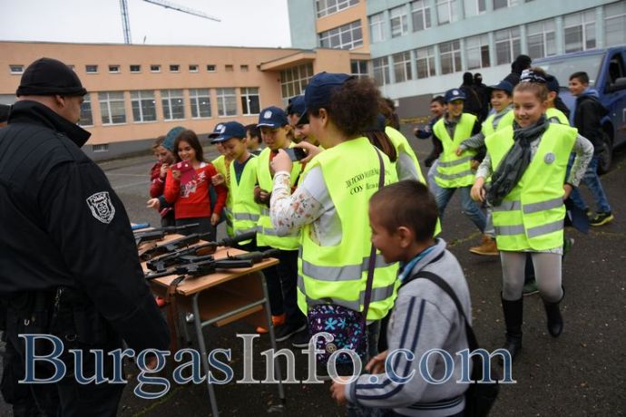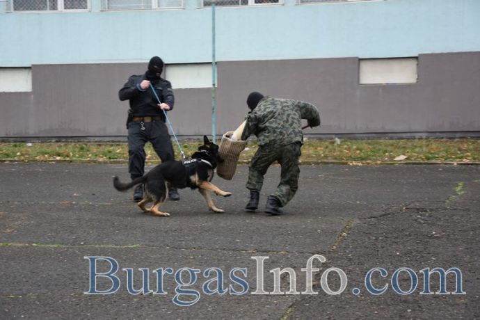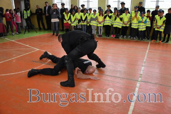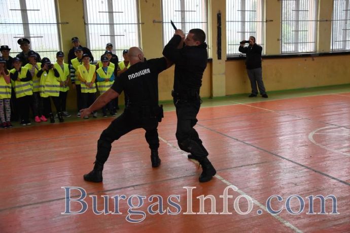 Служителите от сектор „Специализирани полицейски сили” към ОДМВР – Бургас демонстрираха пред учениците уменията си по задържане на извършители на престъпления с използване на полицейски техники и куче. ![]()