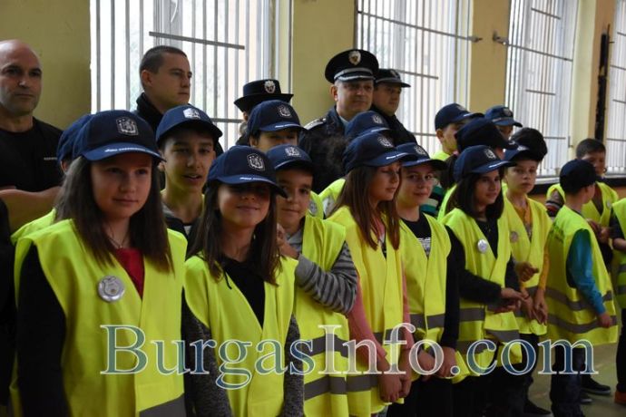 Доброволци от Детското полицейско управление към училище Петко Росен поднесоха своите доброжелания и връчиха официални писма на старши комисар Калоян Калоянов, а от своя страна полицаите наградиха децата със символични полицейски шапки.