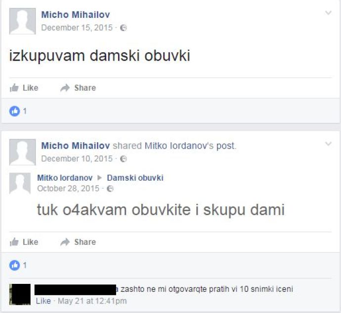 „Изкупувам всякакви носени обувки, с предимство са такива от естествена или изкуствена кожа. Може да имат дефекти и да са мръсни, плащам от 1 до 5 лв. за чифт“, пише в обявата си измамникът, който обаче обувки не купува, но кара потребителките да му изпращат снимки на стоката върху голите им крака.