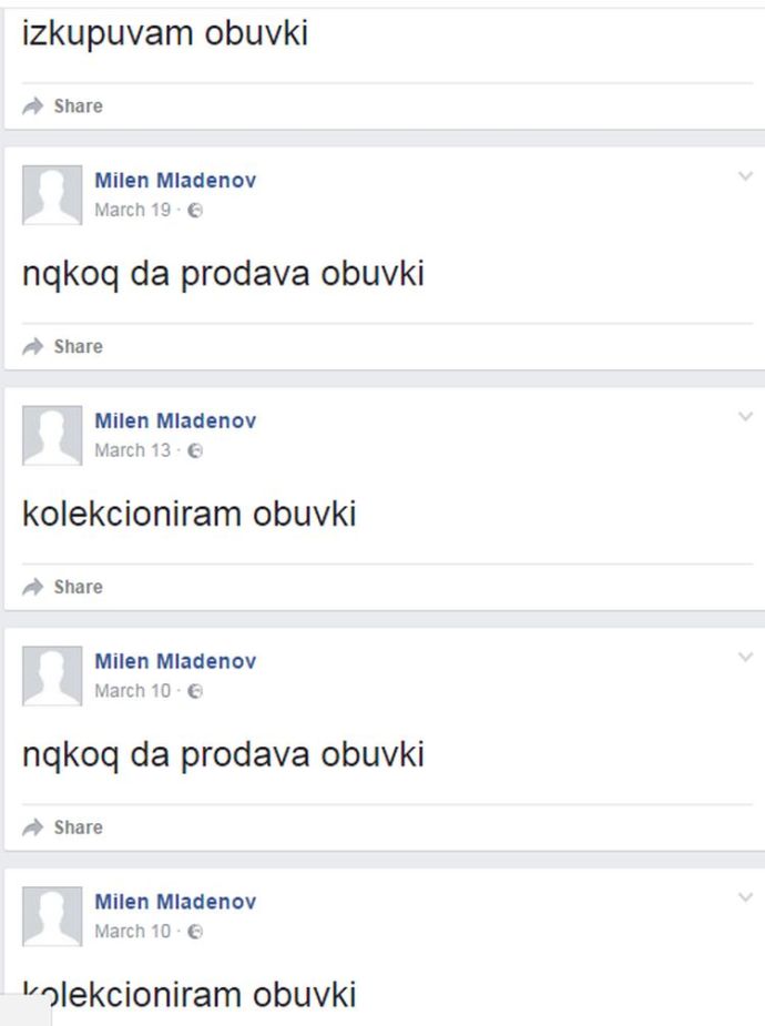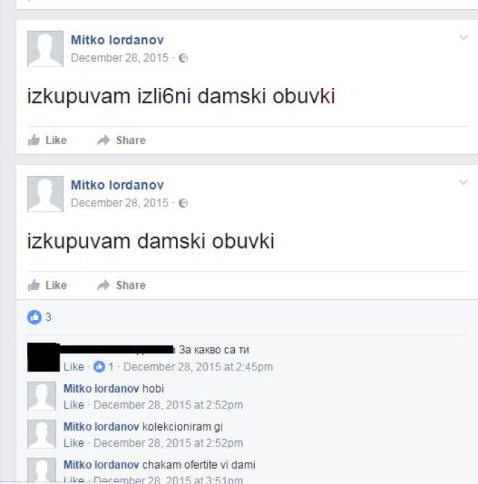 Перверзникът не крие интересите си към стари и вмирисани дамски чепици, защото на нападката на жена под негов постинг, че има фетиш към обувки, Митко без свян отговаря с простичкото „Да“.