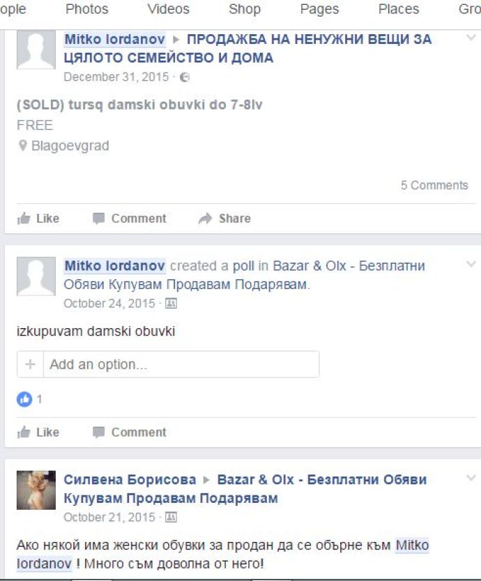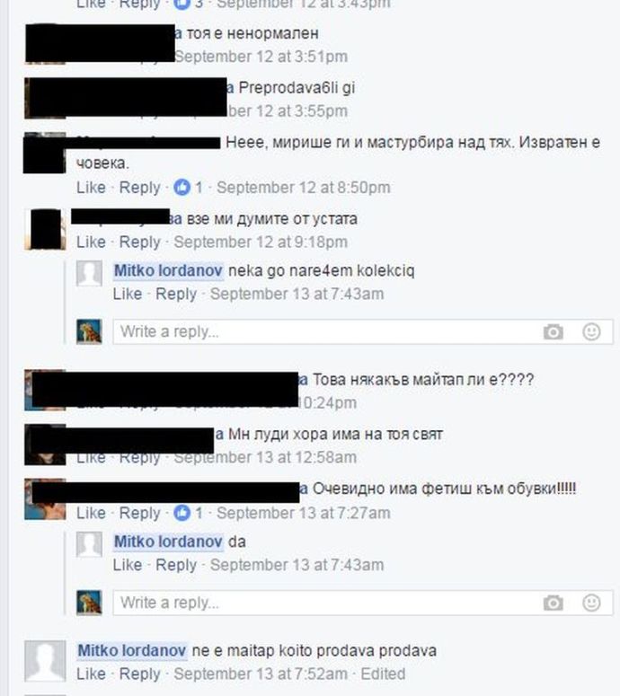 „Момичета, не се връзвайте на този извратеняк, предложих му обувки, но той не купи нищо, само ме караше да пращам снимки, за да види как стоят на краката ми, а после стана толкова нагъл и нахален, че искаше телефона ми за да си говорим лично. Потресена съм, трябва да се докладва и блокира от всички групи“, пише възмутена потребителка. „Мирише ги и мастурбира над тях, извратен е човекът“, директно допълва друга жена.