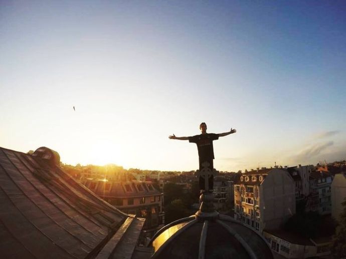 Освен екстремни сгради, интересът на бургазлията е успял да привлече и храм „Св. св. Кирил и Методий”, който в момента е в ремонт. А Стоян не е пропуснал възможността да се покатери на едно от централните кубета и да разпери ръце пред кръста на фона на залеза.![]()