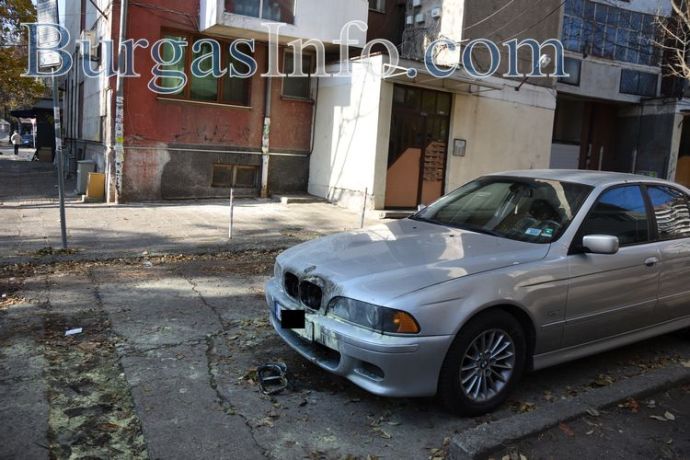 Лека кола „БМВ 520“ пламна посред бял ден на ул. „Цар Симеон“ 131 в центъра на Бургас.