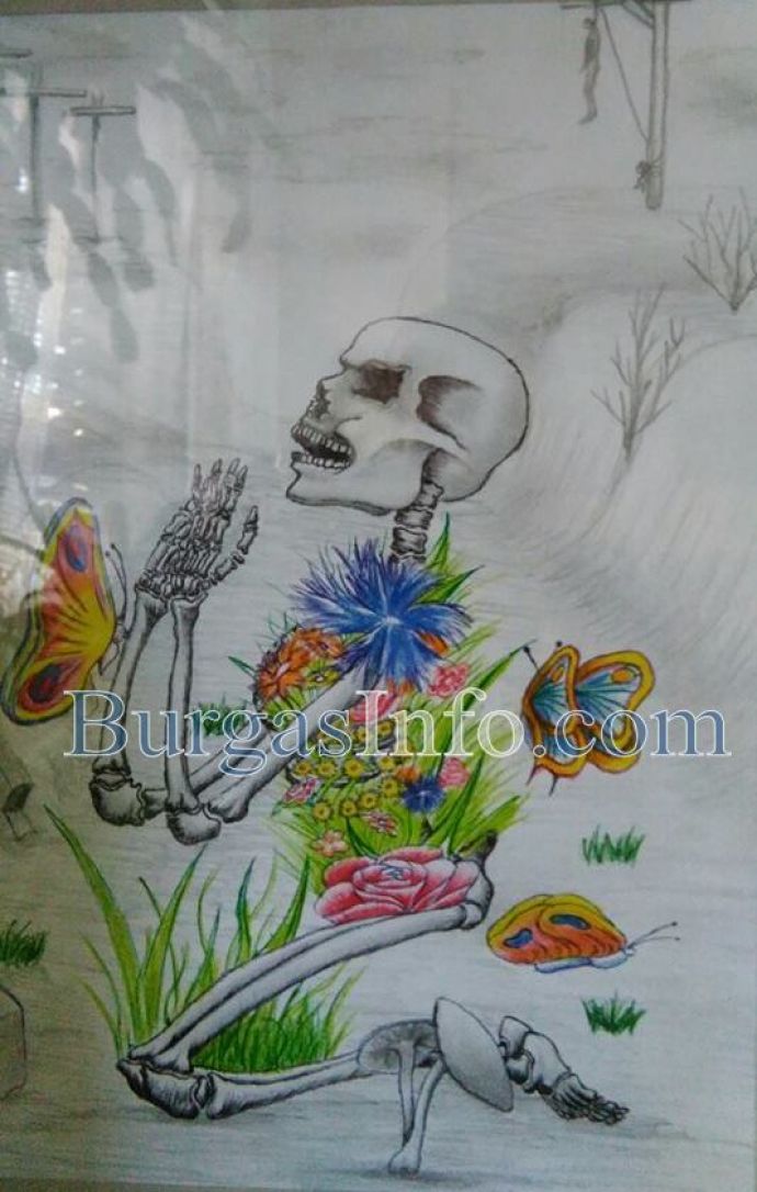 Рисунска с впечатляващ стряскащ сюжет е творил в затвора известният бургаски рецидивист Симеон Стоянчов – Малката Рижа. Наш репортер се натъкна на творението, изобразяващо коленичещ в поза за молитва скелет, нарисуван с тънък черен контур и подчертан с контрастиращи в ярки цветове пеперуди и цветя. В далечината над него се вижда бесило и огромни три кръста в сиво. Рисунката е правена с молив, химикал и флумастер. Опитен психолог вероятно би могъл да разчете посланията в нея.
