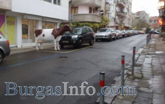 Крава стряска бургазлии в центъра на града. На видеото, изпратено ни от читател на БургасИнфо, се вижда крава, гордо заела място за паркиране на ул. "Ген. майор Лермонтов".
