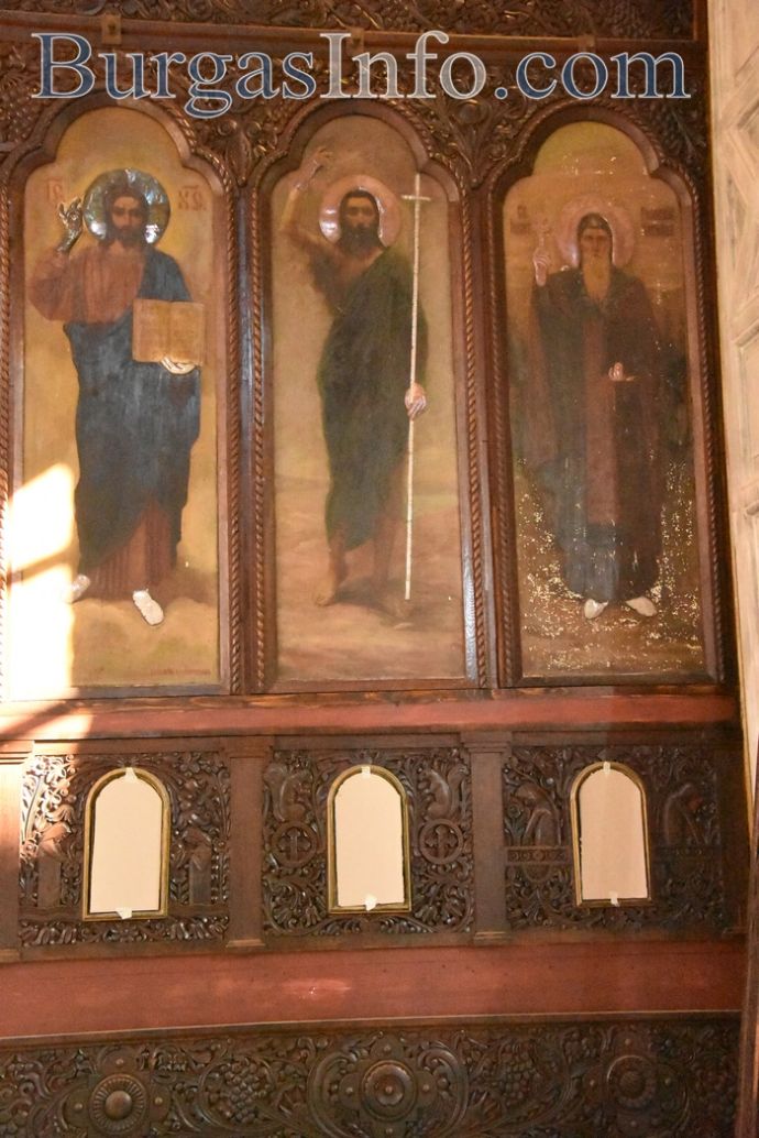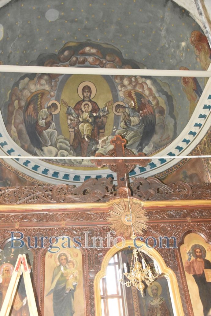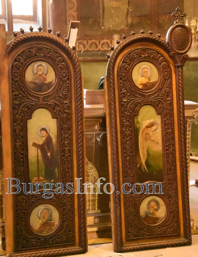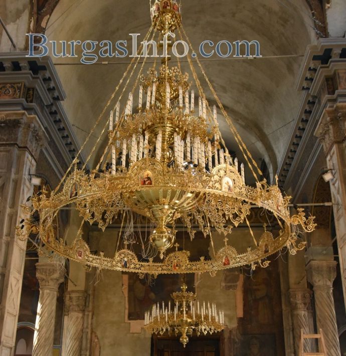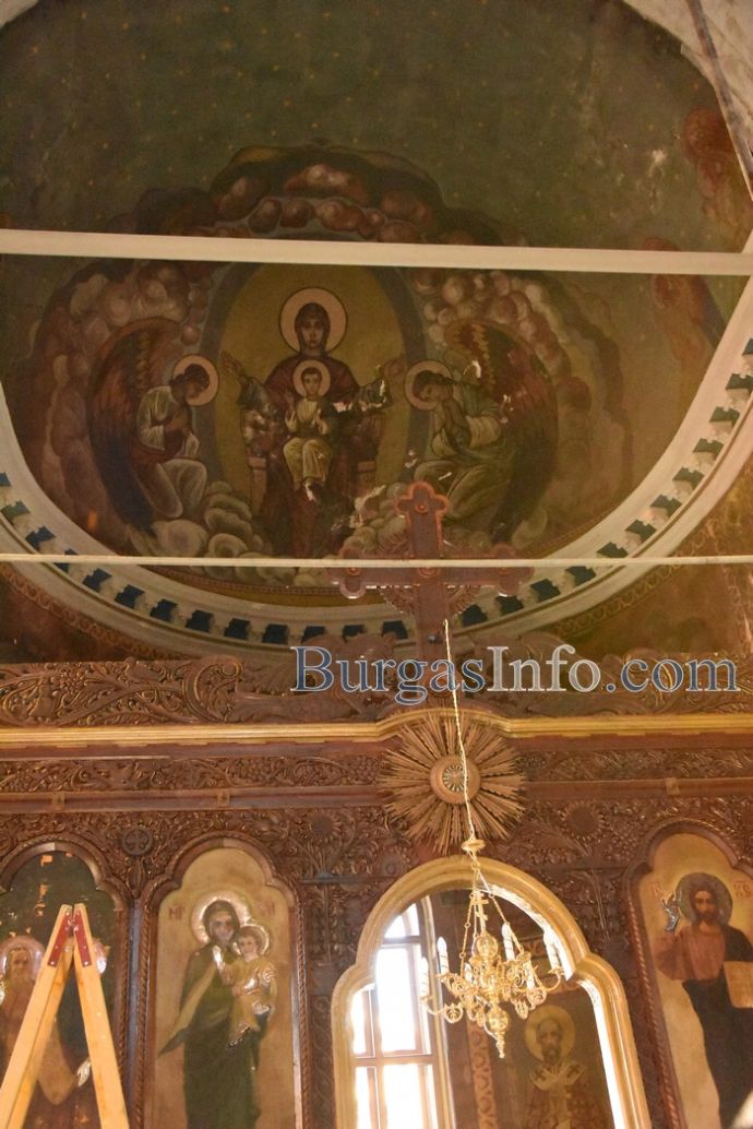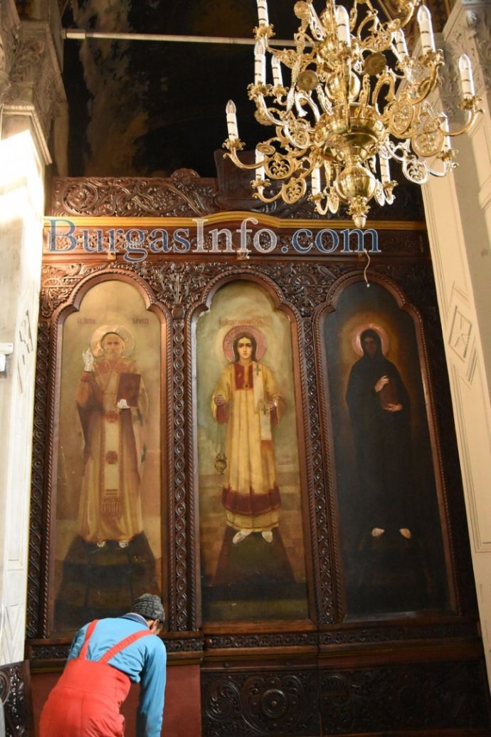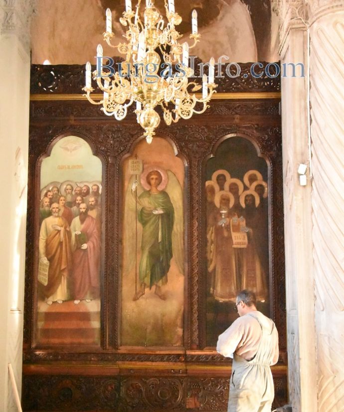 Екип на БургасИНФО видя довършителните дейности в църквата, където в момента се поставят уникални полилеи, реставрира се иконостаса. Основната работа вече е на привършване, като и след празника на Бургас ще продължи реставрацията на иконописите.