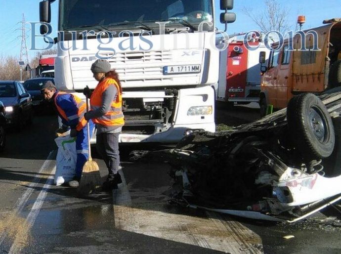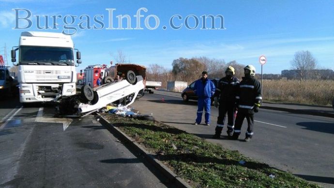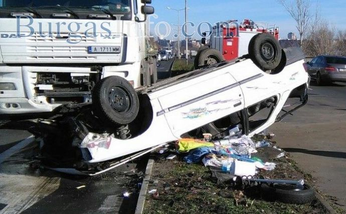 Лекият автомобил „Пежо“, който се обърна по таван до стадион „Черноморец“ на бул. „Тодор Александров“ в Бургас летял с бясна скорост от „Меден рудник“ към центъра, заявиха участници в автомелето пред БургасИНФО. Колата буквално изхвърчала от пътя и помляла още два автомобила и се забила в камион ДАФ, който превозвал плоскости от завод „Кроношпан“ към Пристанището и пътувал в обратна посока. Едната от колите е изхвърчала към езерото Вая и само храстите са спрели пътя й, за да не падне във водата.