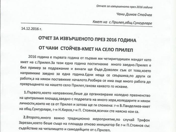 Кметът на сунгурларското село Прилеп Чани Стойчев намери нов начин да привлече вниманието на младите хора към населеното място, в което по списък живеят 506 души, но в действителност са около 300-400. От месец той усилено работи в социалните мрежи, като търси съдействие за организиране на общоселско празненство за Коледа. Във фейсбук той публикува всекидневно снимки, включително и отчета си за свършената работа през изтичащата година, както и телефона си за директен контакт с него.