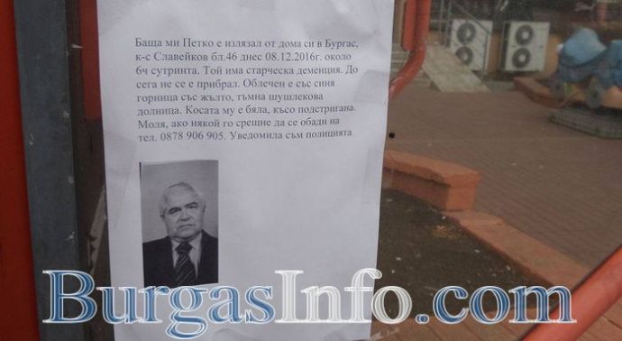 Вече 16-ти ден дъщерята на 77-годишния Петко Стратиев Петков издирва баща си, който изчезнал безследно в ранните часове на 8-ми декември. Мъжът страда от старческа деменция. В деня на изчеването си той се събудил и решил да отиде до магазина в съседния 47-ми блок в к-с „Славейков”. Въпреки че съпругата му се опитала да го разубеди, че е твърде рано, Петко все пак излязал, но така и не се върнал.