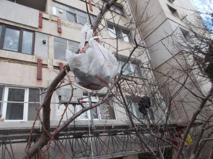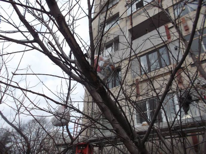 Найлонови торби, пълни с боклук летяха от жилищен блок в комплекс „Славейков“. За гнусната гледка ни сигнализира наш читател, който изпрати и снимки, на които се вижда, че боклукът стои заклещен между клоните на дърветата в комплекса. Очевидно, разчиствайки след обилната коледна трапеза на уморената домакиня не са й стигнали силите да слезе да си изхвърли боклука. В резултат сега всички съседи се „наслаждават“ на този следпразничен натюрморт, а торбите с боклук висят като гнусни гирлянди по клоните.