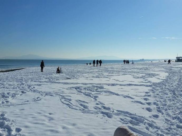 Много хора излязоха в снежния, но слънчев 1-ви януари в Морската градина, а гледката на покрития със сняг пясък е впечатляваща.