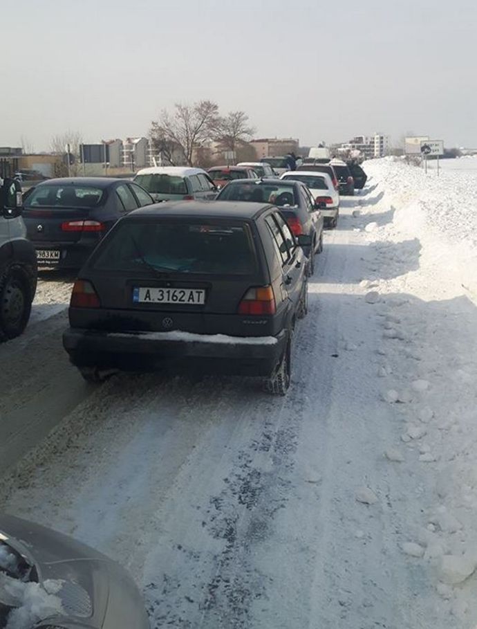 Стотилици коли в двете ленти на пътя от Поморие към Бургас, са в тапа край квартал Сарафово. Стигнахме до тук и край, сега чакаме, като на 15 минути се придвижваме по пет метра. Вече започнахме да се шегуваме, че ще започнем да играем карти, докато чакаме да отворят пътя. Пред нас се вижда море от коли, между тях един снегорин, отпред още коли и пак – снегорин, каза шофьор пред БургасИНФО.