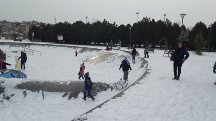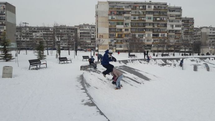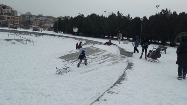 Оказа се обаче, че децата не са се отказали от зимното удоволствие, напротив. Родители и малчугани превърнаха скейт парка в к-с „Изгрев” в писта и днес можеха да се забележат десетки шейни и палавници, които се замерват със сняг. Тези, които пък нямаха шейни, се пускаха по дупе пред зорките погледи на родителите си.![]()
