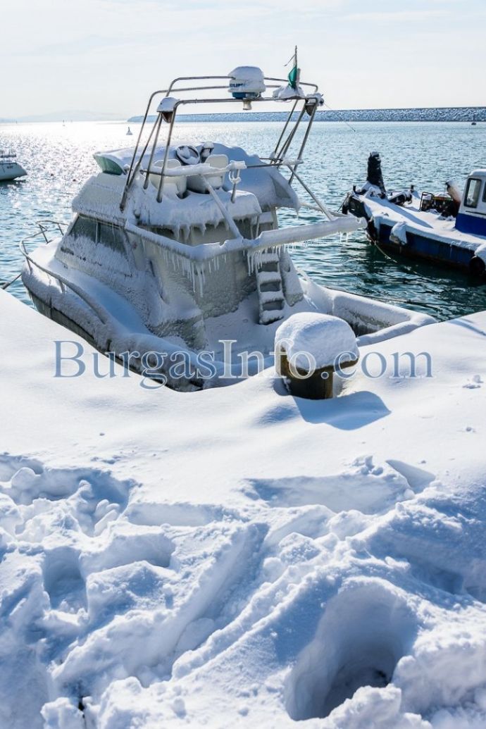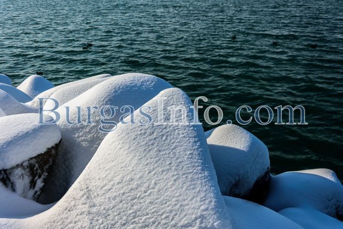 Като в декор за филм на приказките слънцето се отразява в белия сняг и морската вода. Вижте ледената морска приказка, видяна от репортер на БургасИНФО.
