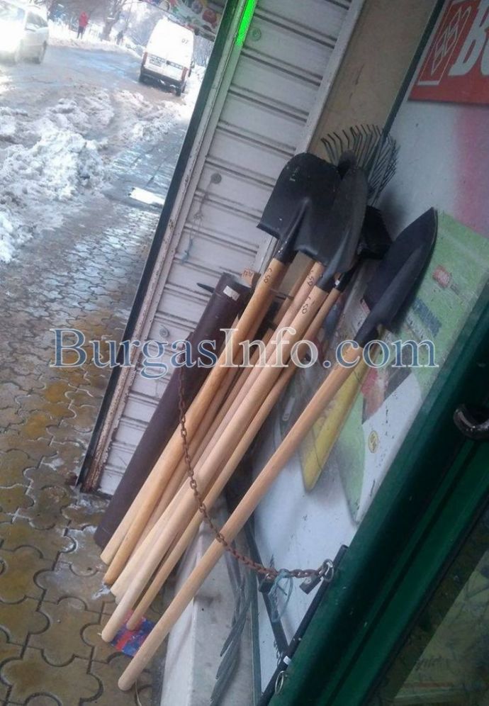 Изкупени са лопатите за сняг в кварталните магазини, установи проверка на БургасИнфо. Още с първият натрупан сняг тяхното търсене се е повишило и днес по рафтовете можеха да се открият само прави градински лопати, които макар и неудобни за риене на сняг, все пак се търгуват успешно. Освен пластмасовите гребла за риене на сняг, са изкупени и въглещарските лопати, които също са удобни за целта, та дори и металните лопати за боклук. Специалните гребла за разбиване на лед обаче се продават само в големите хипермаркети. Цените на целия този асортимент от инструменти варират от 6,90 до 10,00 лева.