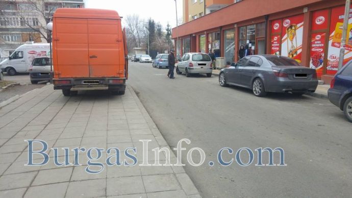 "Районът около блок 40 е оживен, има ново строителство, пък и санират в близост, има и голям хранителен магазин, и зеленчуков магазин, чиято стока е на тротоара и може да се преминава само по една тясна пътечка. Там е и Учителския институт. Оказва се, че ние - жителите на "Славейков" се борим за нашето място. Всеки ден десетки товарни автомобили зареждат магазините без контрол по всяко време на деня, спират върху тротоарите, пречат на пешеходците, рушат общинска собственост. Ето този знак от два дни лежи на земята, няма как лек автомобил да го е изкривил така, явно го е срутил голям камион със стока. Ще се спъне някой в него. Жени с детска количка са принудени да вървят по улицата, защото тротоарът е паркинг, а минават коли. Не сме на село, за да няма движение. Хаос цари тук всеки ден", разпалено обяснява Трифон.