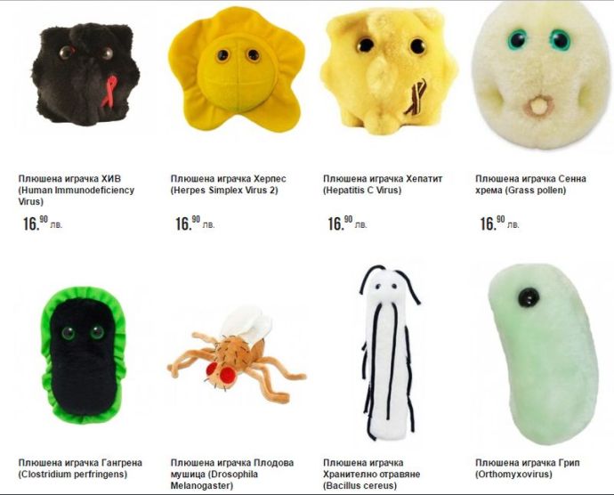 "Забавни, образователни и сладки. Микробите и болестите никога не са били толкова очарователни, чак да ти се прииска да се сгушиш в тях". С този рекламен текст популярен сайт търгува нестандартните плюшени играчки, които според него имат образователна роля.