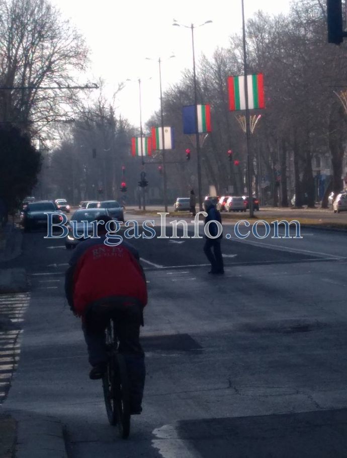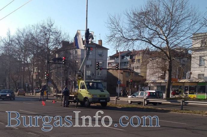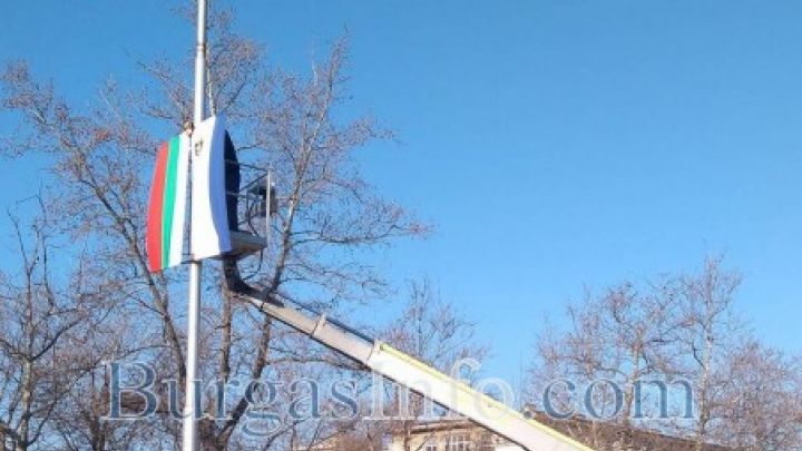 Националният трибагреник вече се вее по улиците на Бургас, видя репортер на БургасИнфо. Работници монтираха българското знаме днес по булевард "Демокрация". По традиция флаговете се обновяват в навечерието на националния празник 3 март.