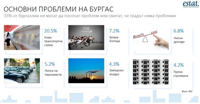 Изследването показва още, че според бургазлии ограничаване на строителството може да доведе до някои сериозни проблеми – намаляване на работните места, покачване на цените на имотите и отблъскване на инвестициите, включително чуждестранните. Анкетираните посочват като най-сериозен проблем в Бургас е организацията на обществения транспорт и новата транспортна схема. Над 21,5% от граждани идентифицират именно това като предизвикателство номер 1. На второ и трето място се нареждат безработицата и ниските доходи. В негативната класация следват недостигът на паркоместа и замърсеният въздух. Едва на шесто място бургазлии поставят като проблем презастрояването. “Организацията на транспорта в момента излиза категорично като проблем номер 1 за бургазлии, но е важно да се отбележи, че в момента има повишена чувствителност заради скорошните промени и това, че за хората все още това е нещо ново.”, обяснява Иво Желев. Близо 15% от анкетираните смятат, че градът няма сериозни проблеми. Цялостната оценка на качеството на живота в Бургас също е много висока – 7,2 по скалта от 1 (много зле) до 10 (много добре).