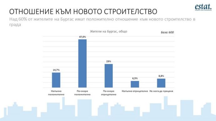 Проучването на Агенция за бизнес изследвания “ЕСТАТ” - „ОТНОШЕНИЕ КЪМ ЖИЛИЩНОТО СТРОИТЕЛСТВО И РАЗВИТИЕТО НА гр. БУРГАС“ e проведено сред 600 граждани на Бургас на възраст над 18 години чрез преки стандартизирани интервюта в дома на респондента. То е реализирано по заявка на строителни компании, членове на Камара на строителите в България – Бургас.