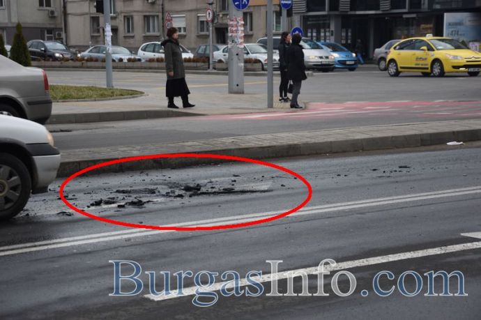 Лека кола „Ауди“ пламна на светофара на кръстовището между централните булеварди „Христо Ботев“ и „Сан Стефано“, в района на бившата Билкова аптека в центъра на Бургас.
