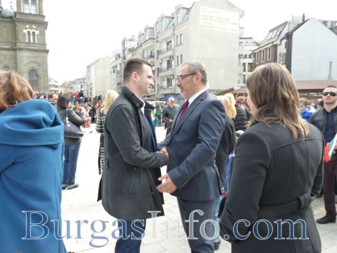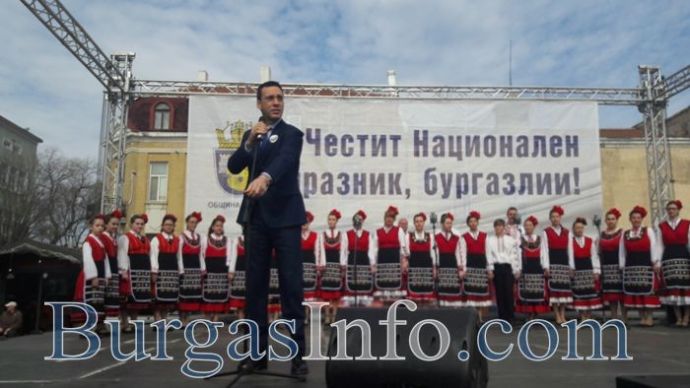 „Има ден в календара, който за нас, българите, е съкровен и непреходен, ден, който не е белязан от следите на времето. Този ден многовековната българска история свързва само с една-единствена дума, думата Свобода или накратко - 3 март! Длъжни сме да помним този ден, в който са събрани векове народни страдания, усилия и стремеж за свобода! Длъжни сме да го завещаем на нашите деца! Длъжни сме да му отдаваме заслужената почит и уважение! Не заради нас, а заради героите от Копривщица, Перущица, Брацигово, Батак, четите на войводите Панайот Хитов, Филип Тотю, Хаджи Димитър, Стефан Караджа, Христо Ботев, българските опълченци, извоювали правото ни днес да сме свободни. Затова на този ден нека бъдем горди, че не сме получи свободата си даром! Затова на този ден нека сведем глави и се поклоним пред всички знайни и незнайни воини, отдали живота си за българската, за нашата свобода!”, каза кметът на Бургас Димитър Николов от сцената, на която с огромни букви пишеше: „Честит 3-ти март, бургазлии!”.