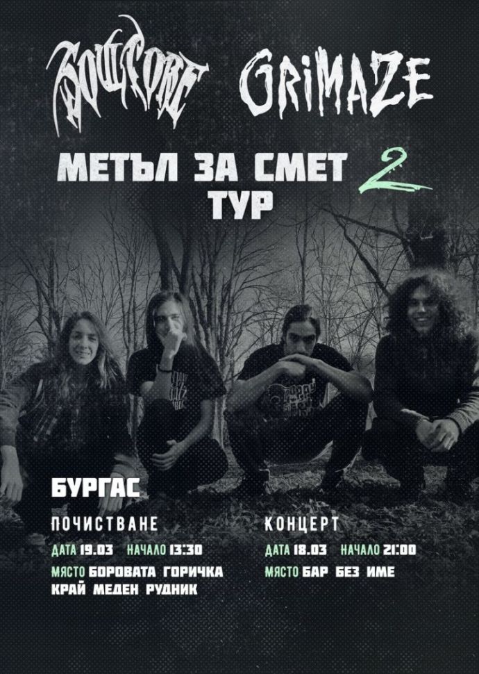Концертът на Grimaze в Бургас ще се състои вечерта на 18 март, събота, в "Бар без име" заедно с бургаската група Soulcore. Почистването ще е на другия ден от 13:30 ч. в боровата горичка край „Меден рудник“.
