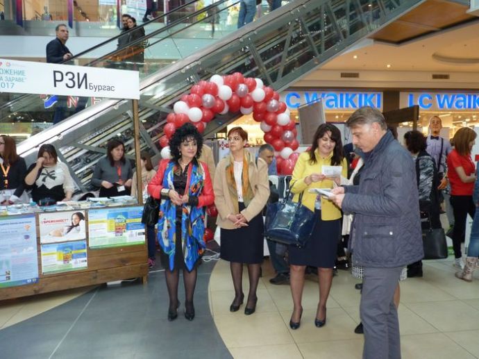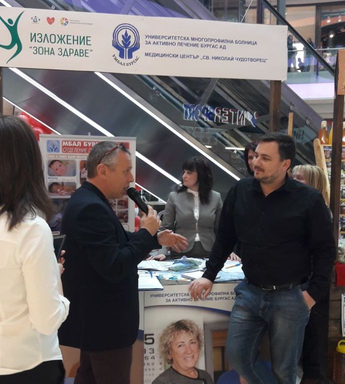 Най-голямата болница в областта – УМБАЛ Бургас, показа силно участие във второто издание на „Зона Здраве”, което се провежда днес и утре в мол „Галерия” – Бургас. Изложението бе открито от зам.-директора на РЗИ и председател на Съвета на директорите на УМБАЛ Бургас д-р Вергиния Цанова, зам.-областния управител Севдалина Турманова и Мая Казанджиева от Дирекция “Социални дейности, здравеопазване и спорт” в Община Бургас.![]()