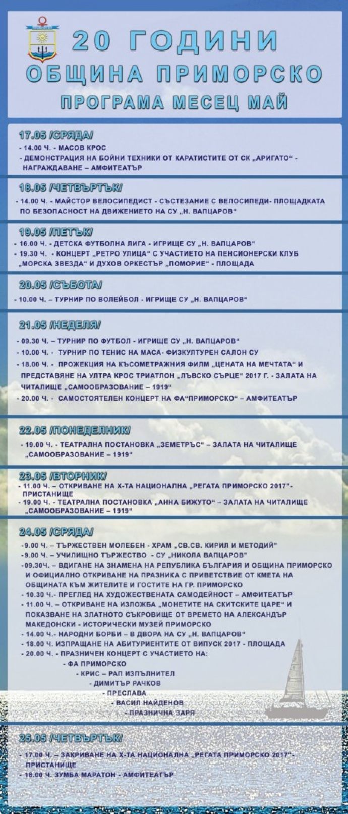 Приморско празнува тази година 20 години от създаването си като община. По този повод са предвидени празнични прояви, които ще продължат от 17-ти до 25-ти май, като кулминацията е на 24-ти май. В 9 часа тържествен молебен в храм „Св. Св. Кирил и Методий“, след което ще има училищно тържество в СУ „Никола Вапцаров“. От 9,30 часа е тържествената церемония по вдигане на националния трибагреник и знамето на Общината, както и официалното откриване на празника с приветствие от кмета Димитър Германов. Ще бъде открита и изложба „монетите на скитските царе“ и показано златното съкровище от времето на Александър Македонски в Историческия музей. Абитуриентите на Приморско ще бъдат изпратени в 18 часа, а от 20 часа е празничният концерт с участието на много звезди на българската музика: Васил Найденов, Преслава, Крис, участие ще вземат и Димитър Рачков, както и ФА „Приморско“. Празникът ще завърши с пищна заря.