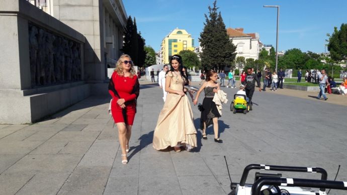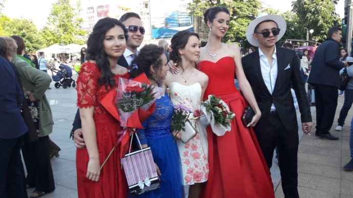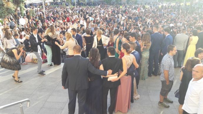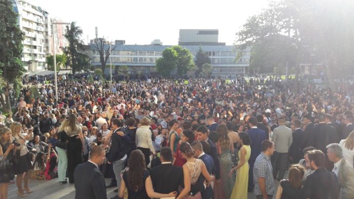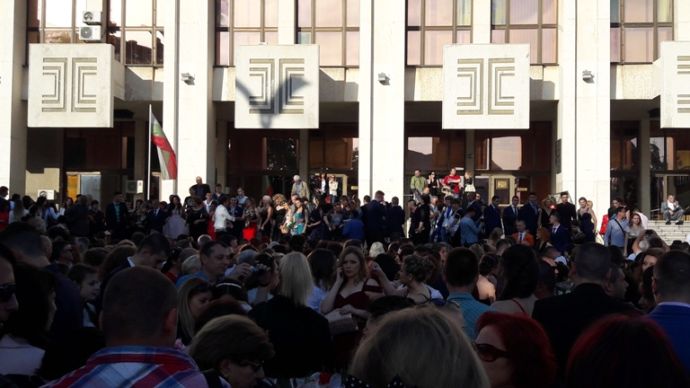 Морето от абитуриенти и изпращачи личеше най-добре от стълбите на съдебната палата, която бе превърната в място за снимки.