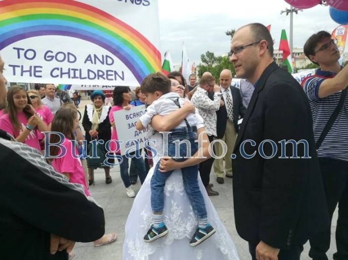 „Всяко дете трябва да има мама и татко”, „Не на хомосексуалната пропаганда в училищата”, „Мъж + жена = дете”. Това са надписите на част от плакатите, които носят със себе си участниците в дефилето. Повечето от жените с булчински рокли стискат за ръчичка своето дете или пък го бутат в детска количка. Шествието е озвучено с популярни детски песни и в момента се отправя към сградата на Община Бургас. Там на площада ще бъдат пуснати балони в небето, в подкрепа на традиционното семейство. Шествието се организира три поредни години, като инициатори са протестантските църкви в града.