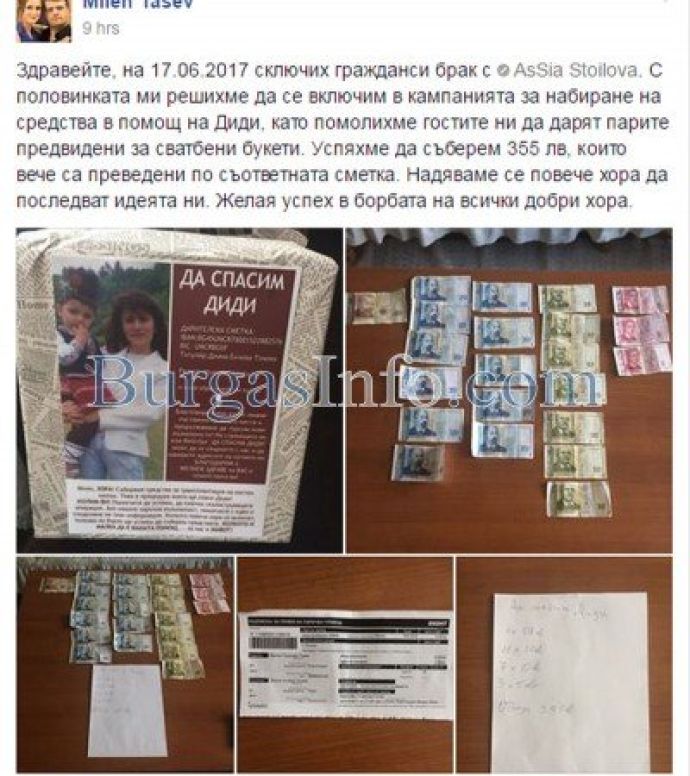 "Здравейте, казвам се Милен и на 17 юни 2017 сключих гражданси брак с моята половинка Ася. С нея решихме да се включим в кампанията за набиране на средства в помощ на Диди, като помолихме гостите ни да дарят парите предвидени за сватбени букети. Успяхме да съберем 355 лв, които вече са преведени по съответната сметка. Надяваме се повече хора да последват идеята ни. Желая успех в борбата на всички добри хора", пише младоженеца в социалната мрежа, но не за да се похвали, а за да даде пример и с желание други да последват техния пример.