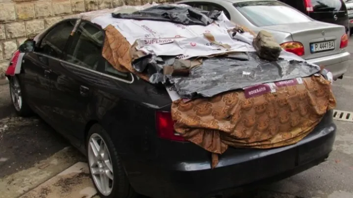 Русенец опакова колата си нестандартно, за да я запази от очакваните градушки. Той я е покрил с няколко слоя от различни материи, включително и със сламена рогозка, а отгоре е поставил като тежести тухли, предаде кореспондентът на БГНЕС от дунавския град.