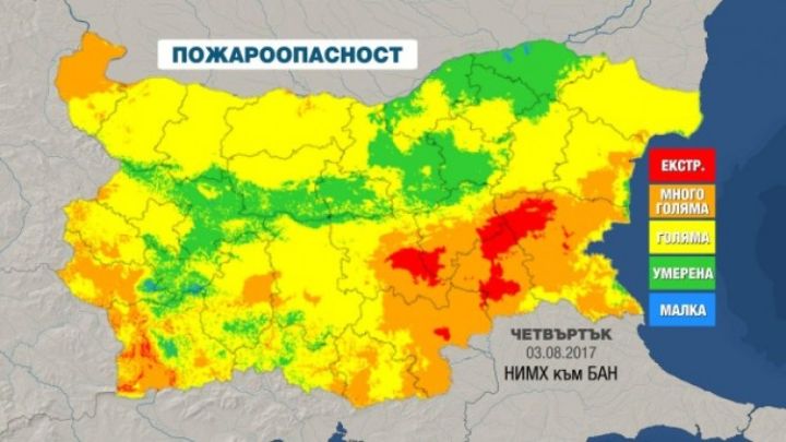 Освен това днес за почти цялата страна е в сила и жълт код за високи температури. Той е в сила за 26 области. Синоптиците предупреждават, че в някои западни и в повечето югоизточни райони рискът от възникване на пожари вече е с код червено – екстремален.