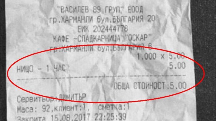 Това беше шега. Не вземаме пет лева за нищо. Това обясни в ефира на национална телевизия Живко Василев, собственикът на заведението, в което министерството на туризма започна проверка. Поводът бил сигнал от клиент, който представил и касова бележка за 5 лв. за “нищо – 1 час” (виж ТУК).