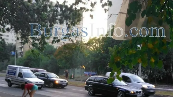 Служебен автомобил на фирма за пране на килими и „Ауди” се сблъскаха на оживения булевард „Проф. Яким Якимов”, през който минава почти целия трафик от Южното Черноморие към магистрала „Тракия”. В момента двата автомобила са в средната лента, заедно с още един - БМВ.