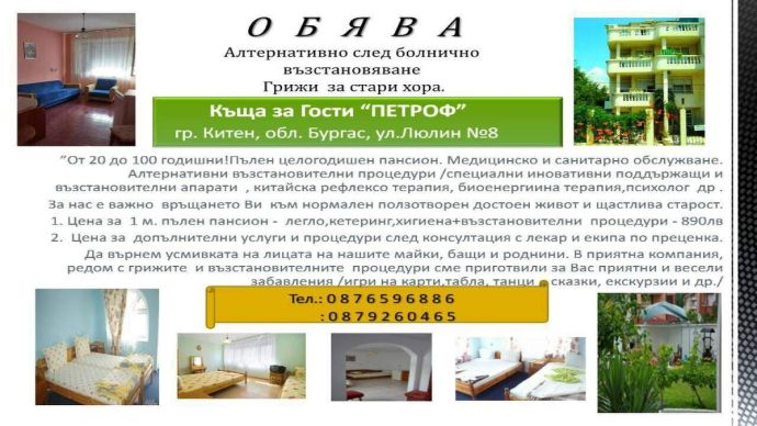„Целта ни е да върнем усмивката по лицата на нашите майки,бащи и роднини. Създали сме приятна атмосфера и редом с обгрижването и възстановителните процедури, сме се погрижили нашите пациенти да имат и социален живот. Те могат да се включват в рзлични забавления – танци, игри и екскурзии”, обясняват от къща за гости „Петроф”, която се намира в град Китен.