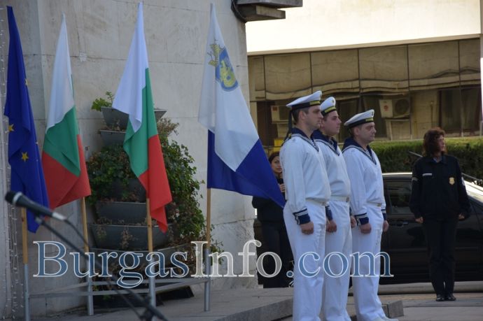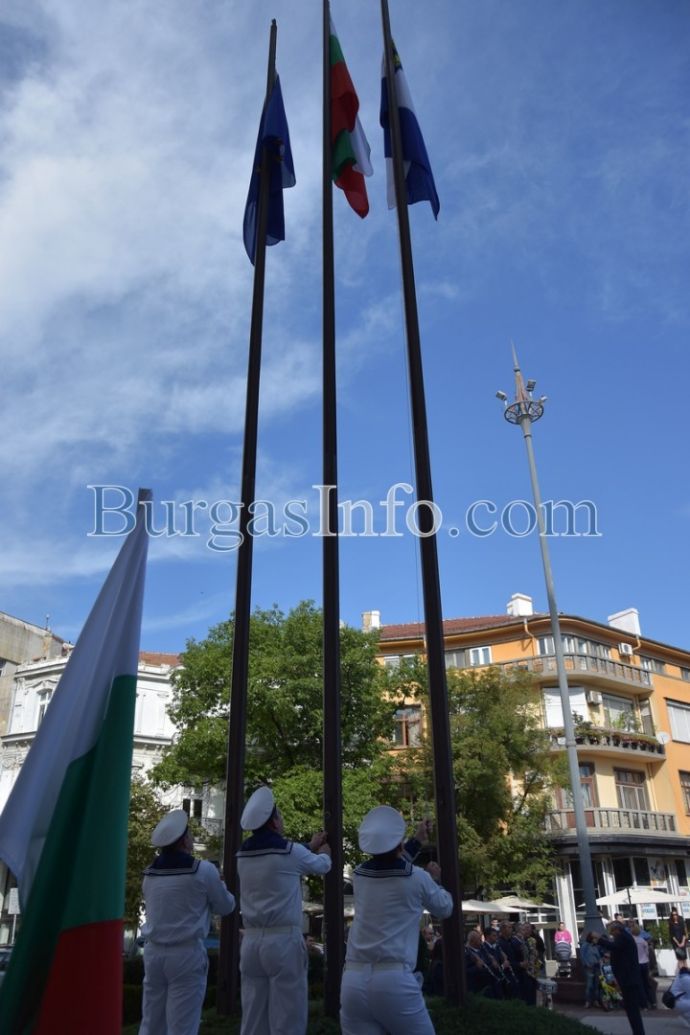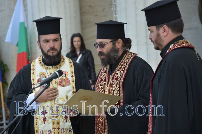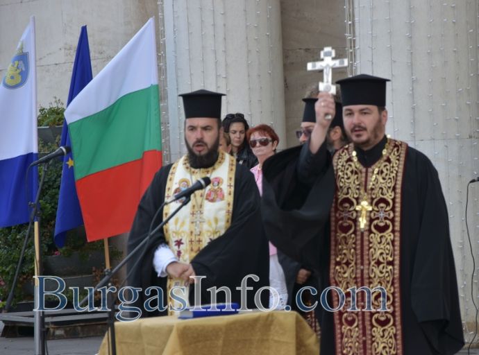 Празничните тържества продължиха с отслужване на молебен за благоденствието на България и ритуал по издигане на националния флаг и флаговете на Европейския съюз и Община Бургас.